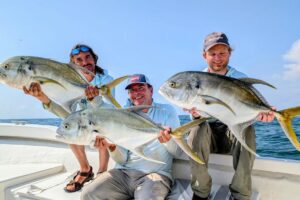 Al snel vangen we een aantal vissen. Geen kanjers, maar het is een leuke visserij. Natuurlijke kleuren en rood/wit doen het goed. Het is nog niet zo heet, later op de dag zal het vissen in de oeverzone minder vis opleveren maar nu gaan ze los. Soms zwemmen er wel vijftig stuks achter ons kunstaas aan en kun je ze allemaal vangen als je wil. Sommige worpen leveren soms twee vissen tegelijk op, het moet niet gekker worden. Ook jerkend met een ondiep lopend plugje vangen we goed.