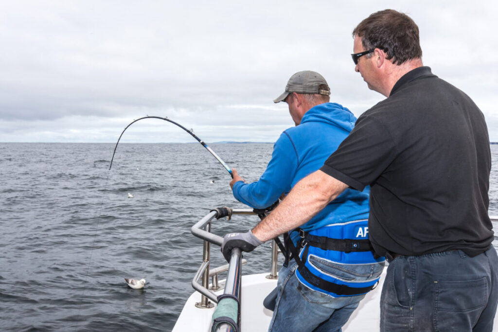 Ik word voorzien van een budpad en een soort van broekje die aan mijn reel wordt bevestigd, dit geeft wat meer controle. Door het bewegen van de boot word er telkens lijn van de reel getrokken die ik later weer opdraai. Ik ben ondertussen al een uur bezig, het zweet breekt me uit, maar er komt wel steeds meer lijn op de reel. Wat ben ik blij met mijn Shimano two speed, die lage versnelling is echt goud waard.