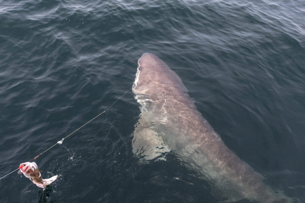 Het beest is zo breed als een paard, met een raar groen oog en gekartelde tanden. Om een eventueel record te claimen moeten we hem aanlanden en officieel meten en wegen maar we besluiten dat niet te doen. Luke schat de vist op zo’n 14ft en 1000Lbs. Dat deze getallen niet geheel uit de lucht zijn gegrepen bewijst de foto van een eerder vangst die hij wel heeft aangeland. Die was 12ft 9inch en 1056Lbs. Nadat we de sixgill weer hebben laten zwemmen zak ik wel even ineen; wat een enorme ervaring! Dit is haaiensoort nummer 2. Dat kopje thee is inmiddels wel koud geworden.