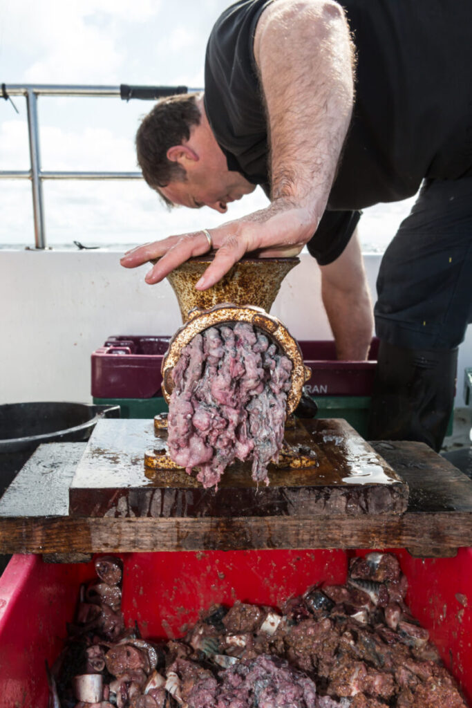 Rubby dubby maken is altijd een smerig werkje, maar wel erg belangrijk. Luke heeft daar een gemodificeerde gehaktmolen voor wat er apart uitziet maar wel goed werkt. Het eindresultaat wordt in een grofmazige nylonkous gedaan en overboord gehangen wanneer we de drift inzetten. De hengels worden op verschillende dieptes variërend van 5 tot 20 meter uitgezet op verschillende afstanden van de boot. De dobber is een grote meerval dobber en niet een ballonnetje zoals ik het gewend ben.