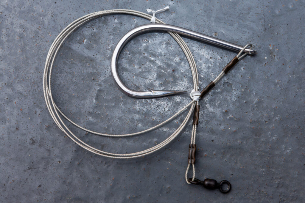 Deze heb ik destijds voor 10 euro gekocht speciaal voor de haringhaai. De rest van het tuig bestaat uit een 100Lbs gevlochten hoofdlijn en een nylon voorslag van 2mm dik. Een afhouder met een pond lood en een staaldraad van 300Lbs maakte de set af. Aan de haak worden makrelenmoten geregen met als hoofdgerecht een pollakflapper. Het hele zaakje gaat enkele reis naar de bodem. Nu is het afwachten of het geluk met ons is.