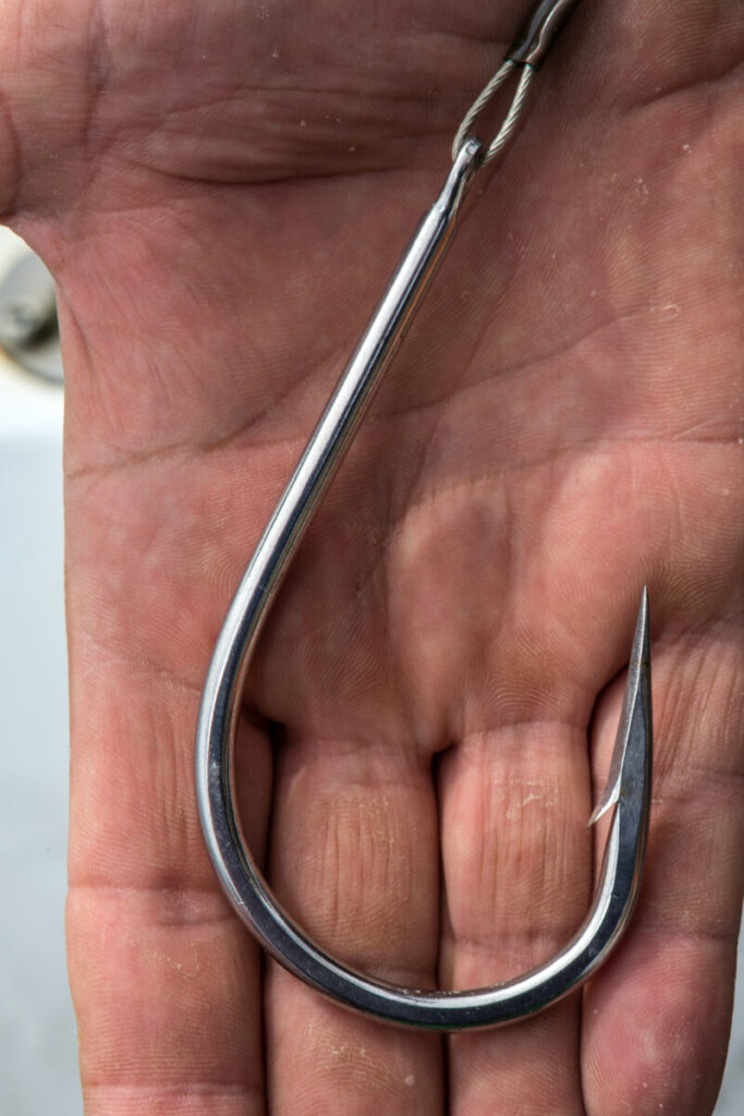 Gelukkig is het de volgende dag weer prima weer. Luke heeft vandaag zijn zinnen gezet op zeskieuwige haai. (In het Engels sixgillshark) Hij heeft een plek in gedachten waar hij al eerder succesvol is geweest. Omdat het behoorlijk diep is vissen we met twee hengels op sixgill en ik ben ‘ The chosen one’ om de eerste haai te vangen. Ik ben ook de enige die zwaar materiaal heeft meegenomen. Luke fronst zijn wenkbrauwen bij het zien van mijn 14/0 gamakatsu chemisch geslepen haak die ik al 15 jaar in mijn bezit heb.