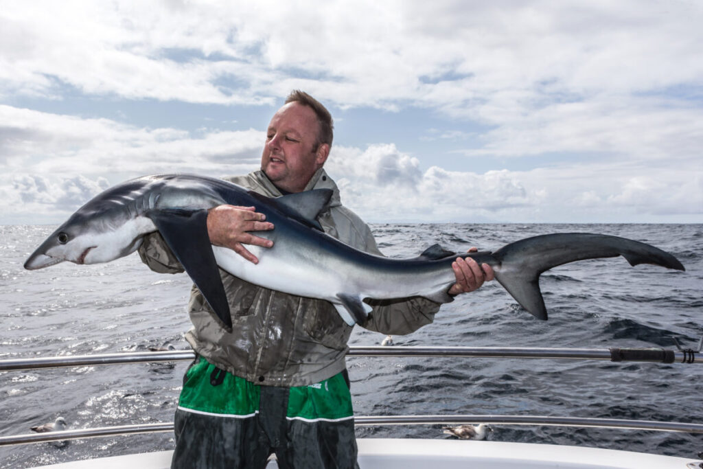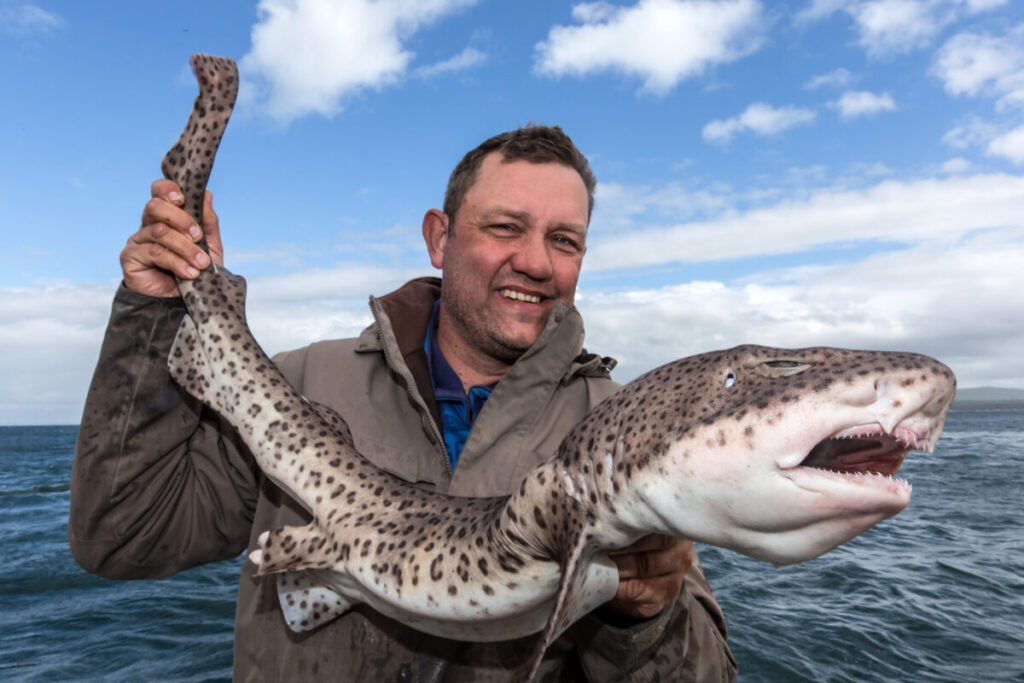 De volgende morgen is het weer echter totaal omgeslagen. De volle zee op voor een haringhaai is geen optie meer. Luke stelt daarom op de Shannon op te gaan voor een ruwe haai (Tope in het Engels). Deze haaiensoort komt hier veelvuldig voor, maar voor het mooie zijn we iets te laat in het seizoen. Als we voor anker liggen beazen we onze haak met een hele ‘flapper’, een makreel waar we de graad uit hebben gesneden. Al snel vangen we een aantal hondshaaitjes, en daarmee haaiensoort nummer vier. We bevissen meerdere plekken in de monding maar zonder succes. Niet zo lang geleden heeft Luke op deze plekken nog ruwe haai gevangen maar vandaag laten ze zich niet zien.