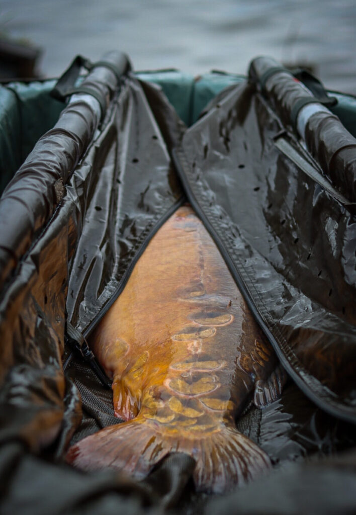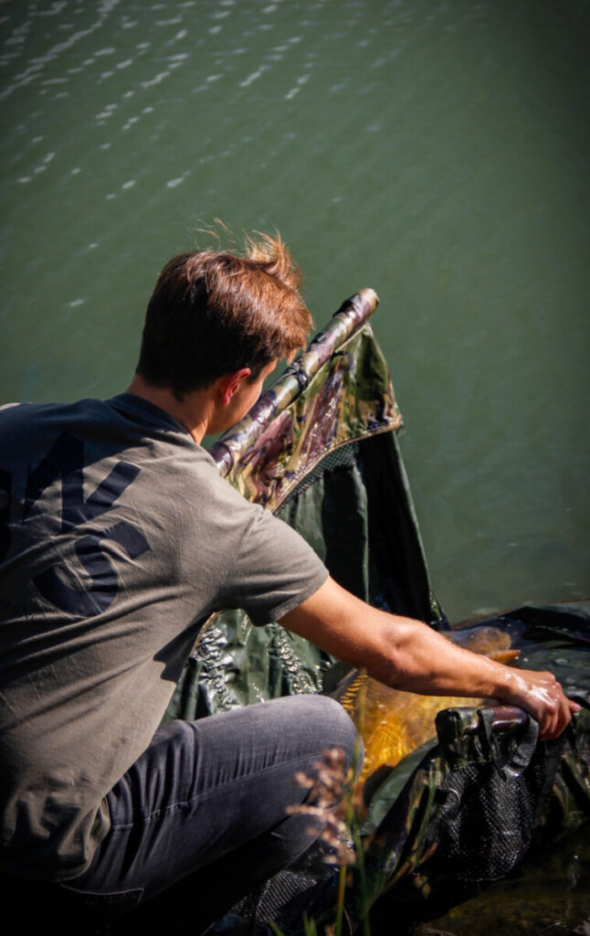 Wanneer een karper gevangen wordt, dan wordt deze vaak even in een sling gestopt. Voor even is dit zeker geen probleem, maar stop hem zeker geen uren in de zak! Ook zijn er nog wat andere aandachtspunten waar je rekening mee kan houden als je een vis even zakt. Wanneer je de vis in de sling legt, zorg dat hij dan gelijk op de bodem van de sling ligt. Gebeurd dit niet, dan glijdt de vis naar beneden bij het optillen van de sling wat voor beschadigingen kan zorgen.