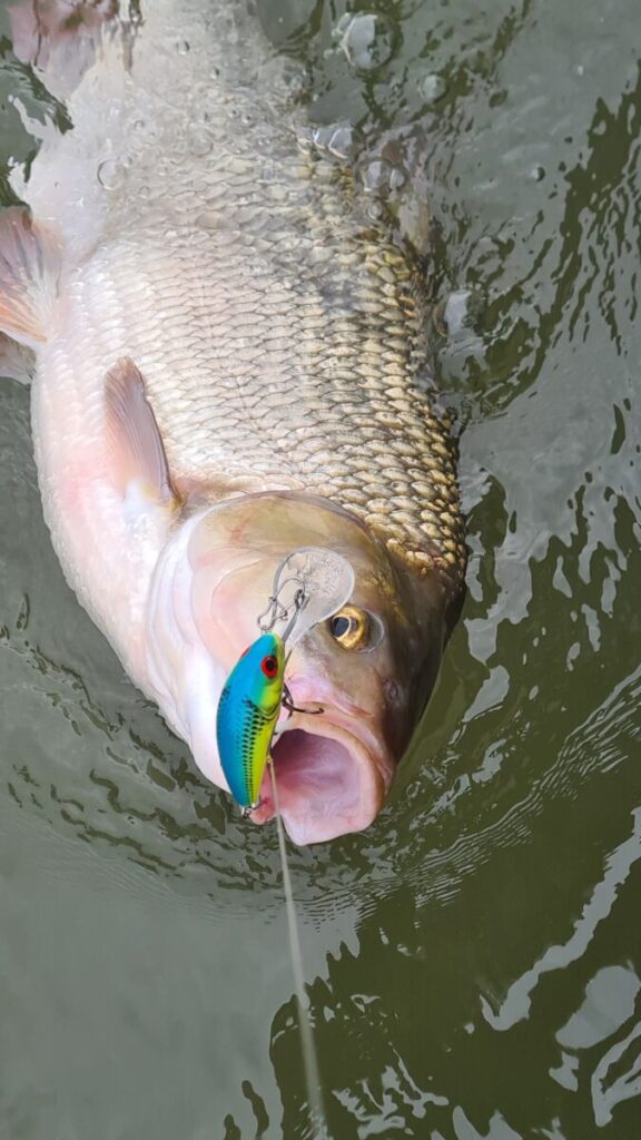 Links en rechts kwamen er toch weer vissen uit tijdens het trollen: geregeld een winde, een mini-snoekbaars of een kleine roofblei. Actie met enige regelmaat, maar nog steeds niet de meerval waar we op hoopten.