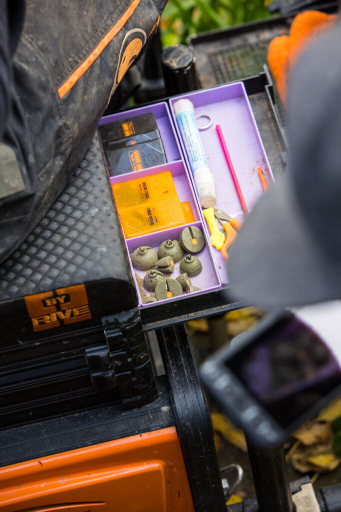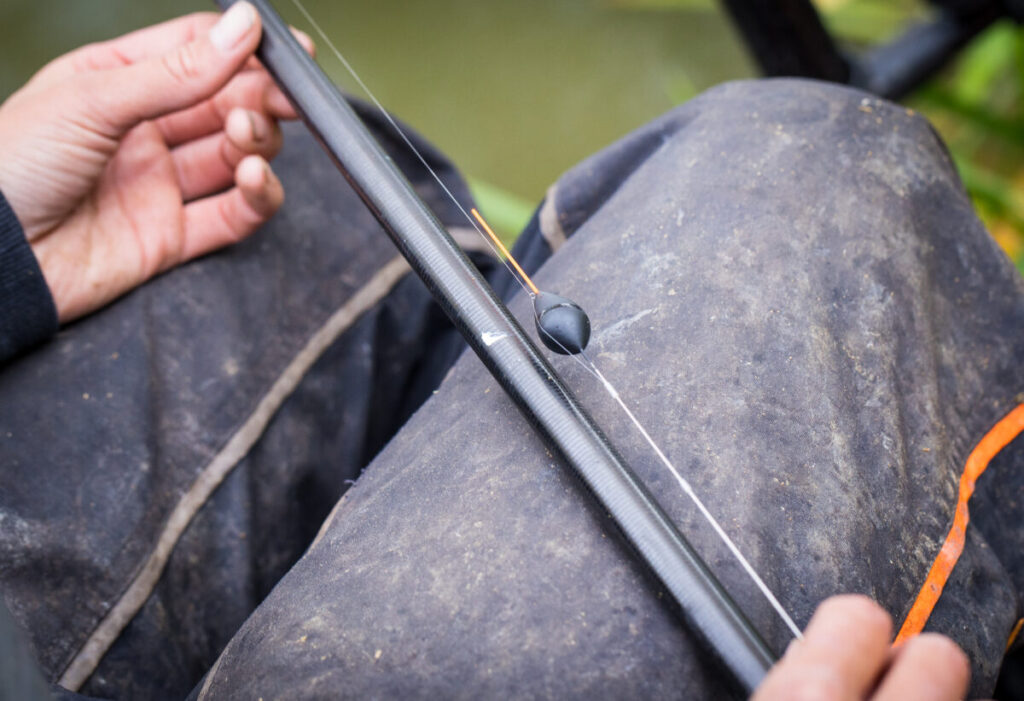 Anja peilt iedere topset individueel uit. “Er zit rek op je lijn waardoor er kleine verschillen kunnen zitten in de reeks montages. Daarom peil ik alles afzonderlijk uit.” Ook iedere opslag moet volgens haar identiek zijn. Dit is de ruimte tussen je dobber en de elastiek connector. Is dit verschillend dan kan wind en stroming er zomaar voor zorgen dat je montage te ver van de plek wordt gedrukt.