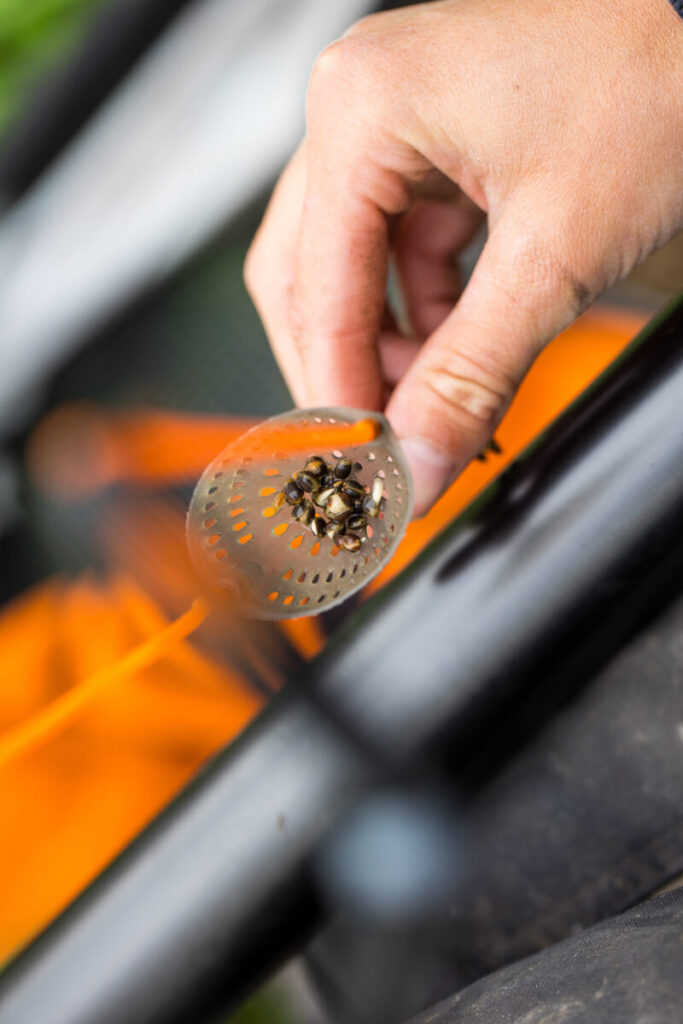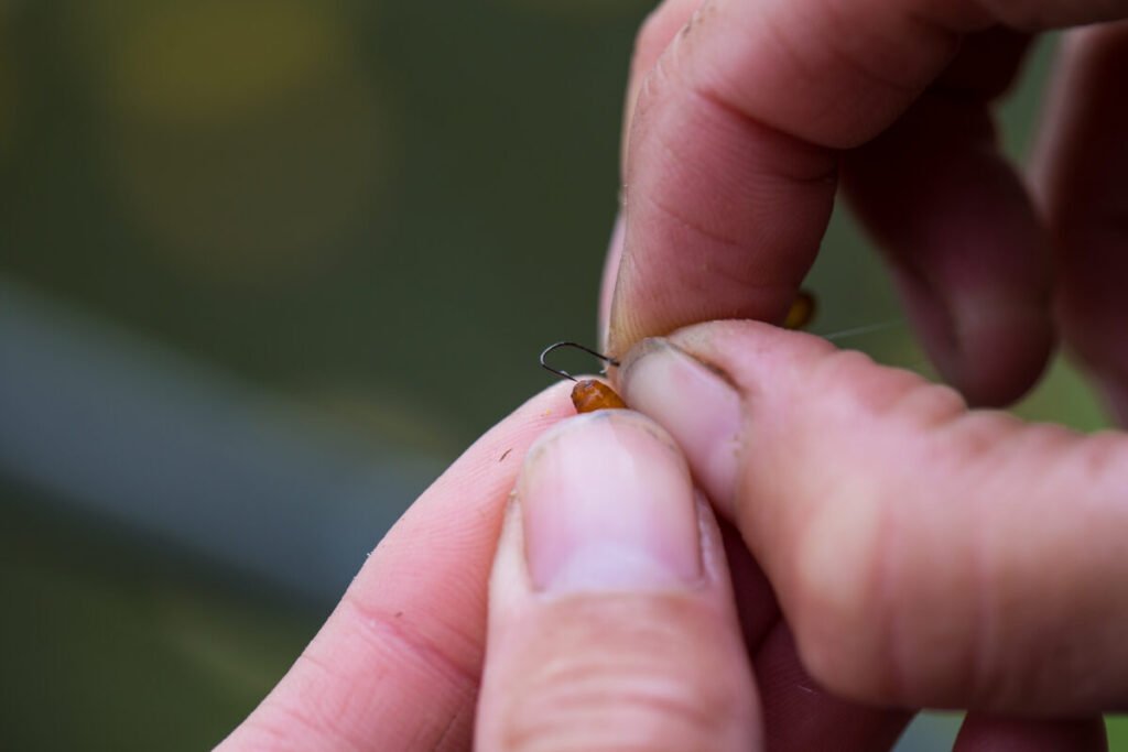 Een goede blik op Anja’s aasplateau leert ons dat er keuze ten over is. Qua haakaas heeft ze graag voldoende opties. Voor haar bestaat de basis minstens uit levende en dode pinken, casters en hennep. Aan de haak kan je kiezen voor meerdere opties en combinaties maar starten doet Anja met een een pinkie. De visserij moet nog op gang komen en zo’n aasje is wat meer allround. Maar door frequent hennep en casters bij te schieten met een katapult gaat de stek op een gegeven moment op gang komen.