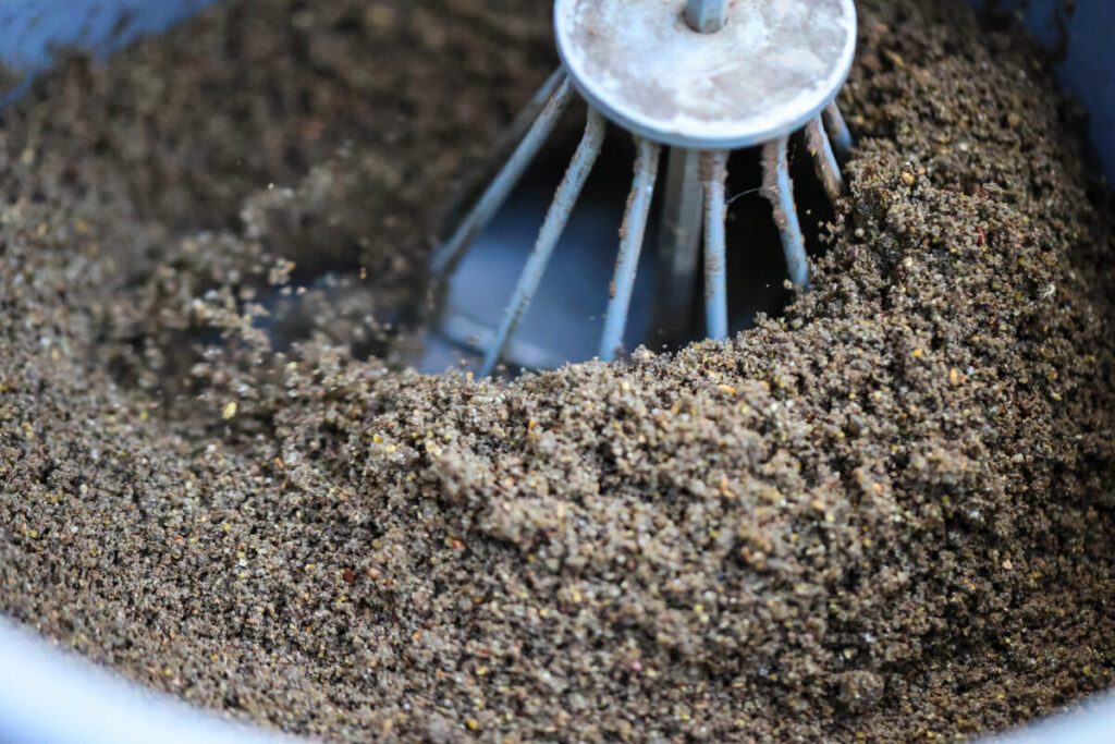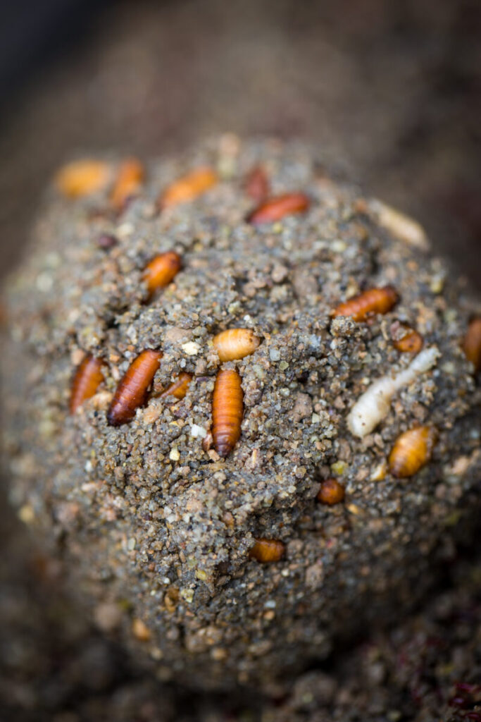 Het voer heeft Anja in deze tijd van het jaar graag wat donkerder. Als de kanalen helderder worden voelen de voorns zich nu eenmaal veiliger boven een donker voertje. Het is najaar en dat betekent dat de vis doorgaans goed wil eten. “Als je nu vis wil vangen, moet je wel tafeltje-dek doen.” Hiermee bedoelt Anja dat er altijd aas door het voer gemengd moet worden. Met het oog op voorns zijn dit casters, hennep en wat dode pinken.